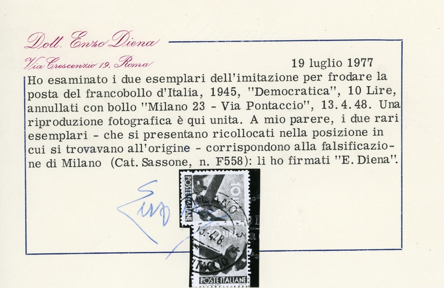 1946 - 10 lire Democratica, falso per posta di Milano, due esemplari (F558), perfetti, usati a Milano 13/4/1948 e ricollocati nella posizione originaria (appartenevano ad una affrancatura di sei esemplari). Rarissimo insieme! A.Diena, cert. Diena.