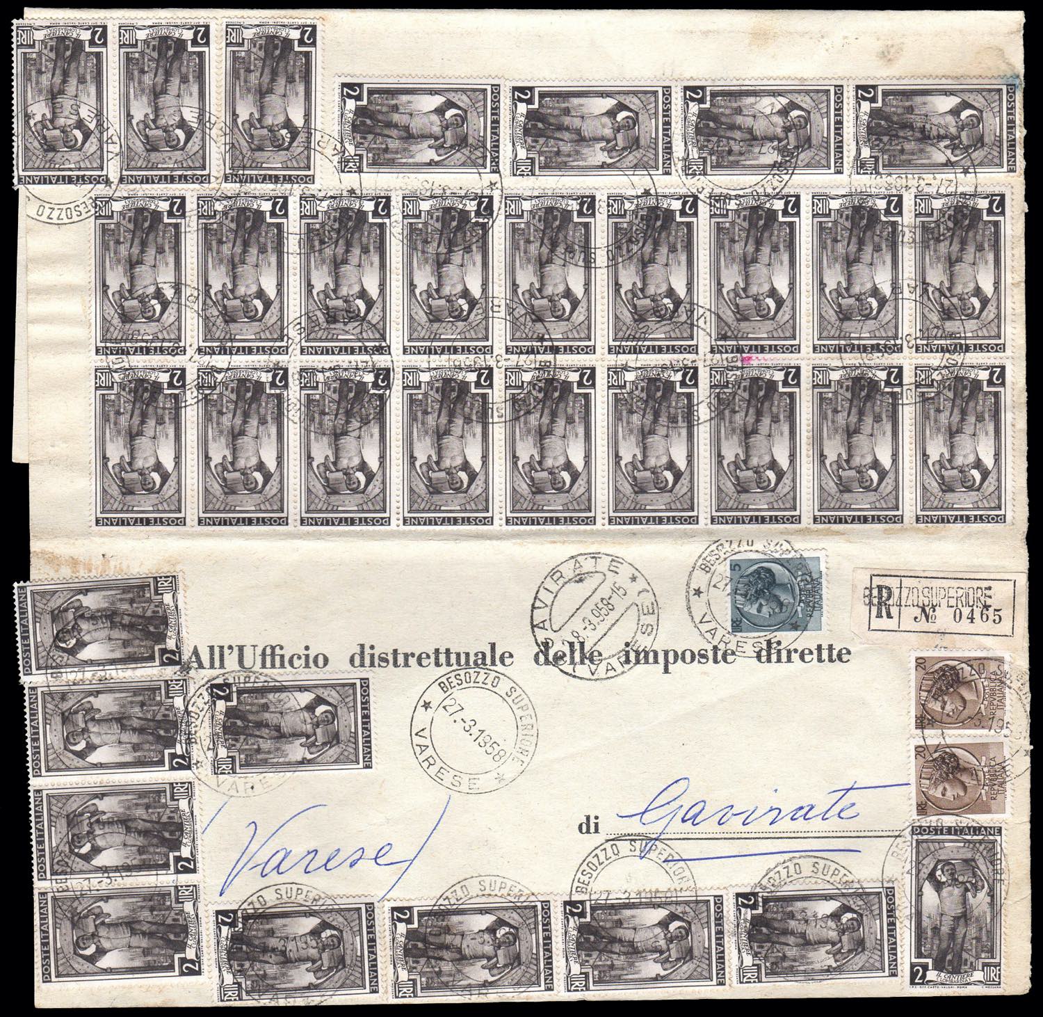 1958 - 2 lire Lavoro, filigrana ruota, 35 esemplari, 5 lire e 20 lire, 2 esemplari Siracusana, filigrana stelle (636,762,768), ottimo stato, su lettera raccomandata da Besozzo Superiore 27/8/1958 a Gavirate. Rara affrancatura multipla del 2 lire.