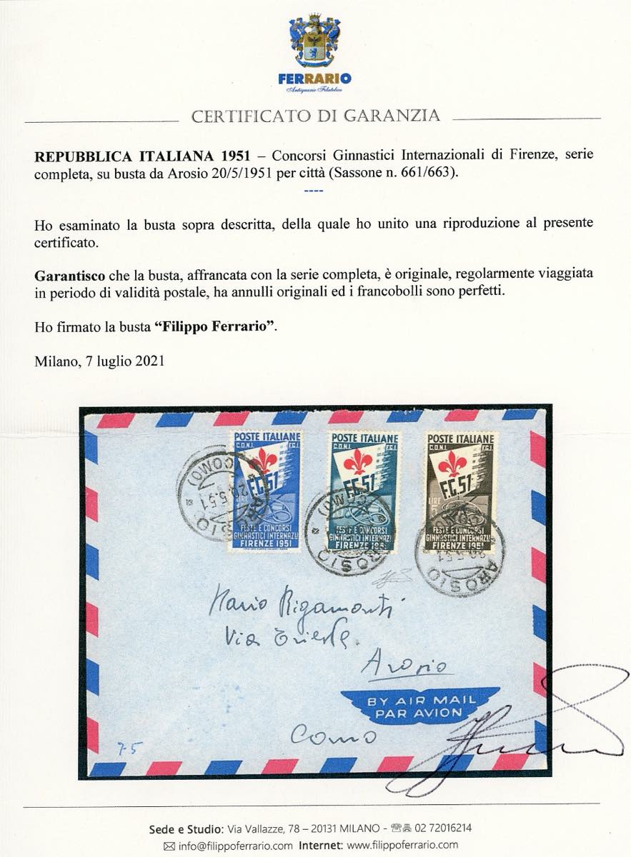 1951 - Ginnici, serie completa (661/663), perfetti, su busta Arosio 20/5/1951 per città. Cert. Ferrario.