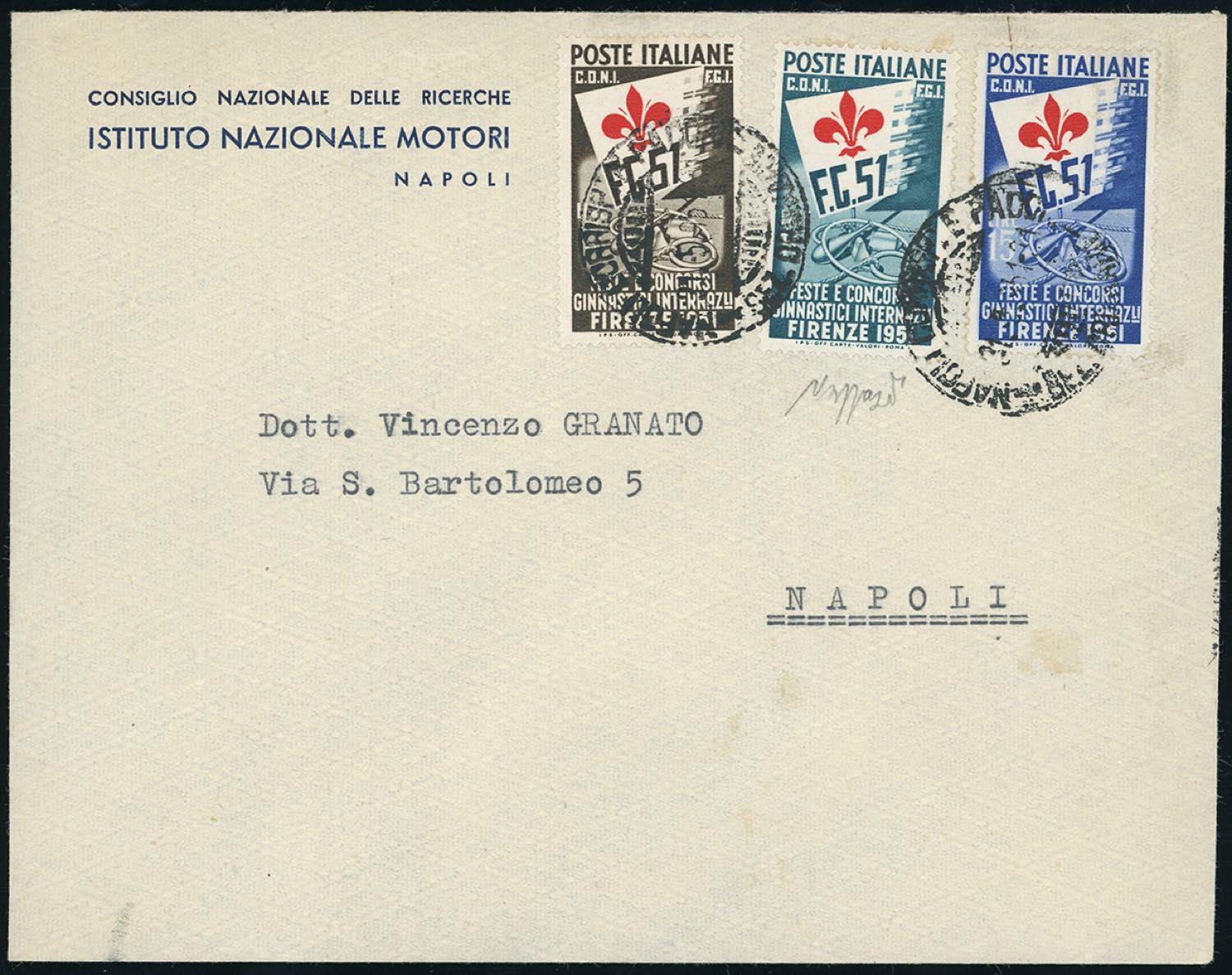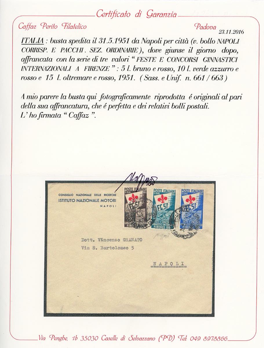 1951 - Ginnici, serie completa (661/663), perfetti, su busta da Napoli 31/5/1951 per città, bollo di arrivo al verso. Cert. Caffaz.