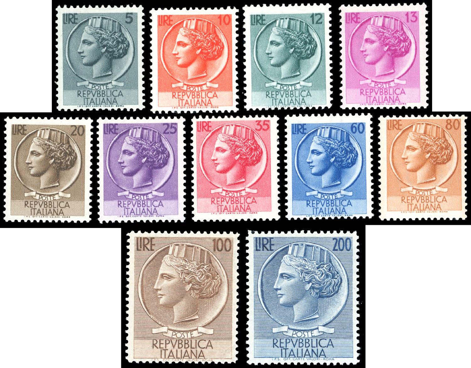 1953/54 - Siracusana e Turrita, filigrana ruota (710/718,747/748), gomma originale integra, perfetti. Belli.