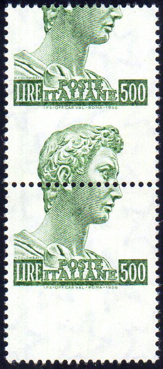 1970 - 500 lire San Giorgio, dent. 14 x 13 1/4, carta fluorescente, coppia verticale con dentellatura fortemente spostata (810A/I), nuova, ... Leggi tutto