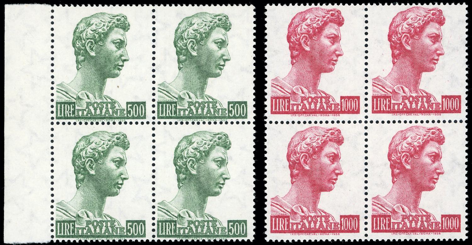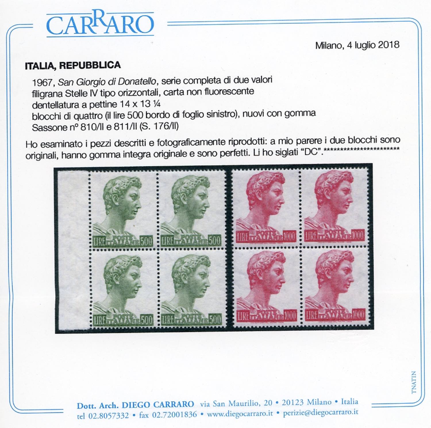 1967 - San Giorgio, serie completa dent. 14 x 13 1/4 (810/II-811/II), blocchi di quattro, gomma originale integra, perfetti. Belli. Cert. Carraro.
