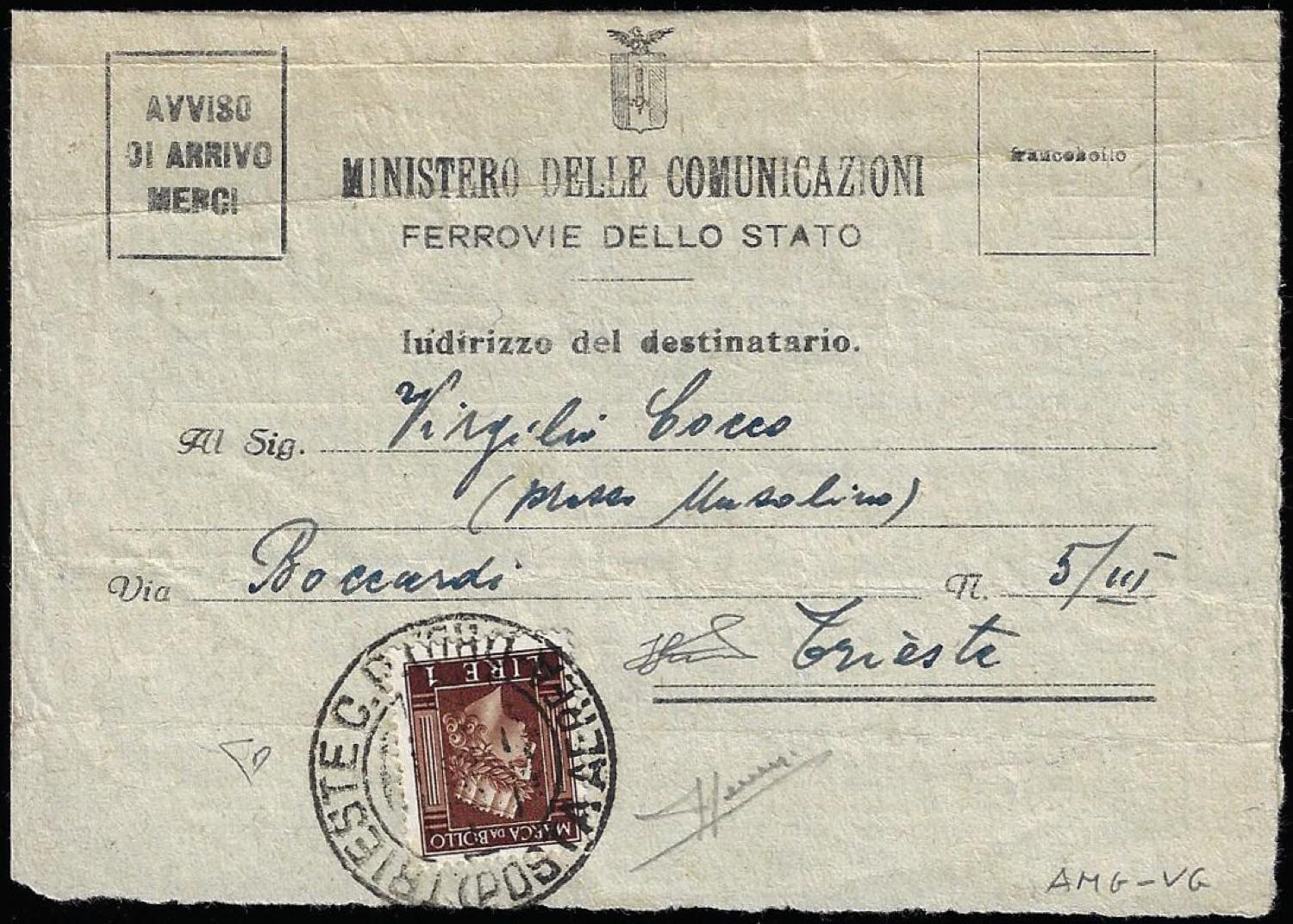 1946 - 1 lire bruno, Italia Turrita, Marca da bollo di Luogotenenza, perfetta, su avviso merci da Trieste 1/7/1946 per città, bollo d'arrivo il giorno successivo al verso. Rarissimo uso postale! Sorani, Ferrario, cert. E.Diena.