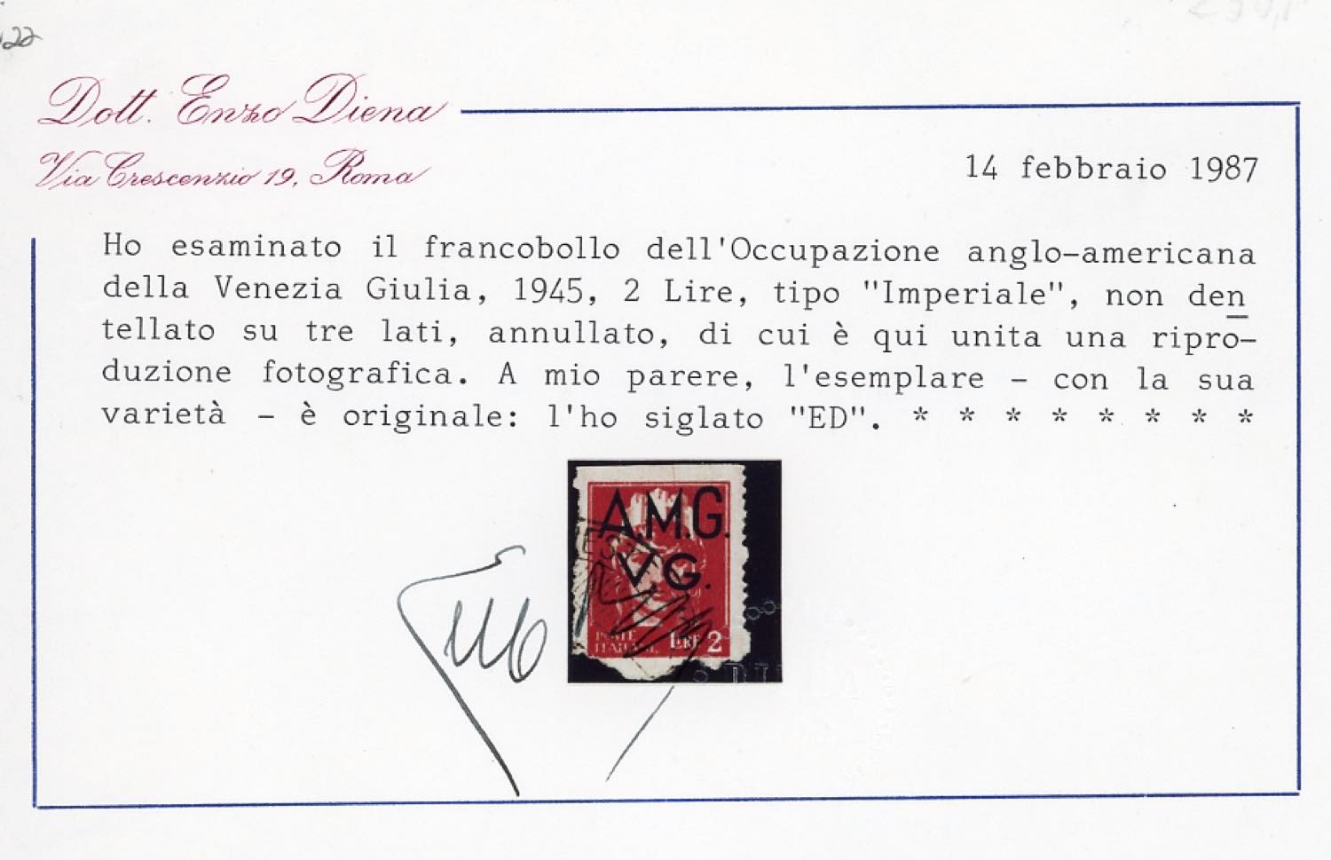 1945 - 2 lire Imperiale, dentellato solo a destra, dentellatura sinistra cieca (9iaa), usato, buono stato. Molto raro, probabilmente unico. Ferrario, cert. E.Diena.