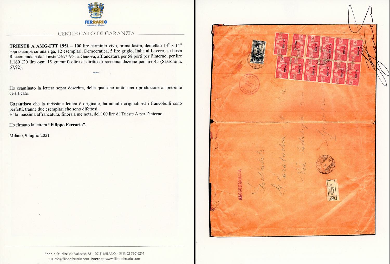 1951 - 100 lire Democratica, soprastampa su una riga, 12 esemplari, 5 lire Italia al Lavoro (67,92), su busta raccomandata di 58 porti da Trieste 23/7/1951 a Genova. Si tratta della massima affrancatura nota del 100 lire di Trieste A per l'interno. Rarità del settore. Cert. Ferrario.