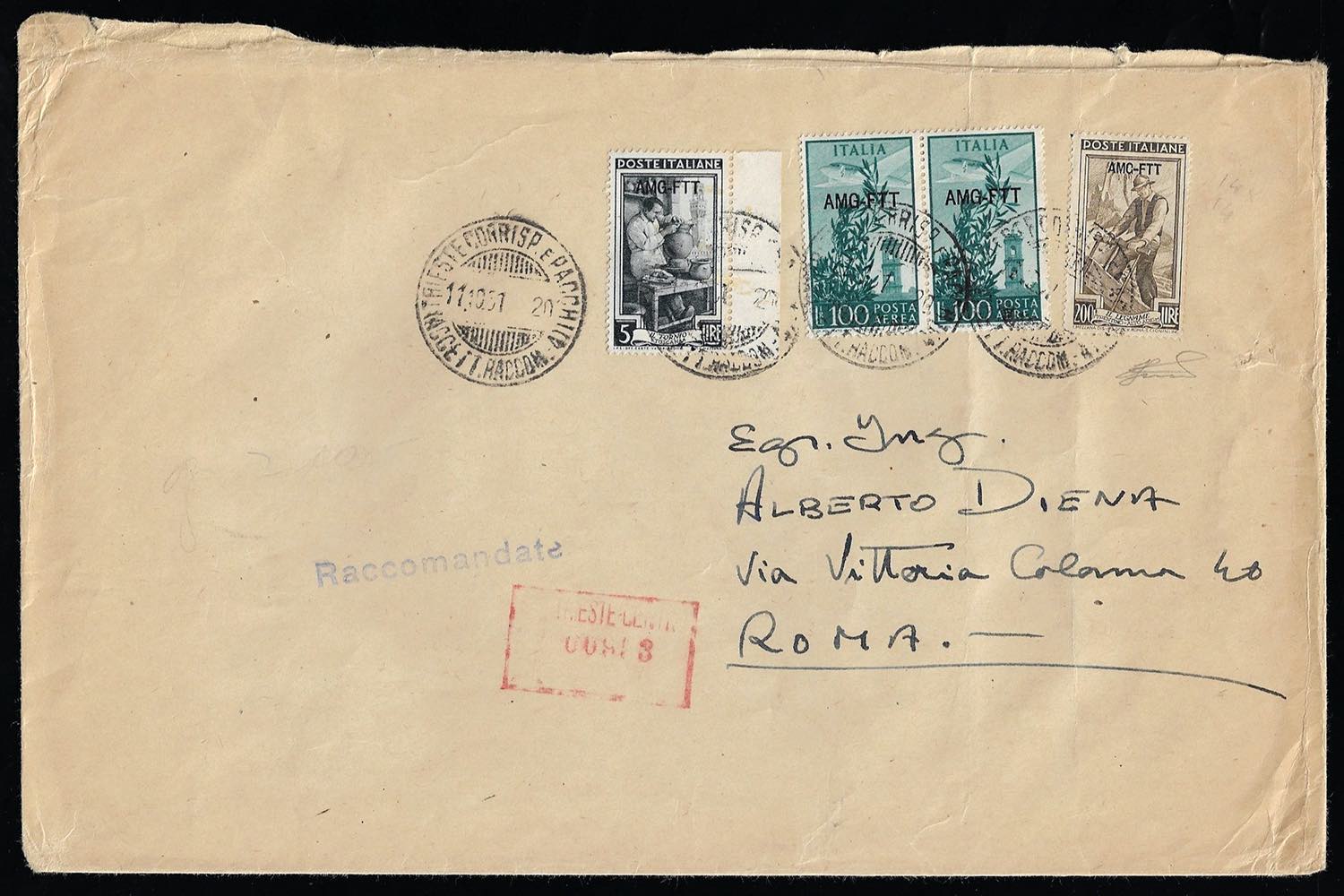 1951 - 200 lire, 5 lire lavoro, 100 lire Campidoglio, coppia, tutti soprastampati su una riga (107,92,A22), perfetti, su busta raccomandata da Trieste 11/10/1951 a Roma. Rarissimo uso dell'alto valore per l'Italia. Ferrario.