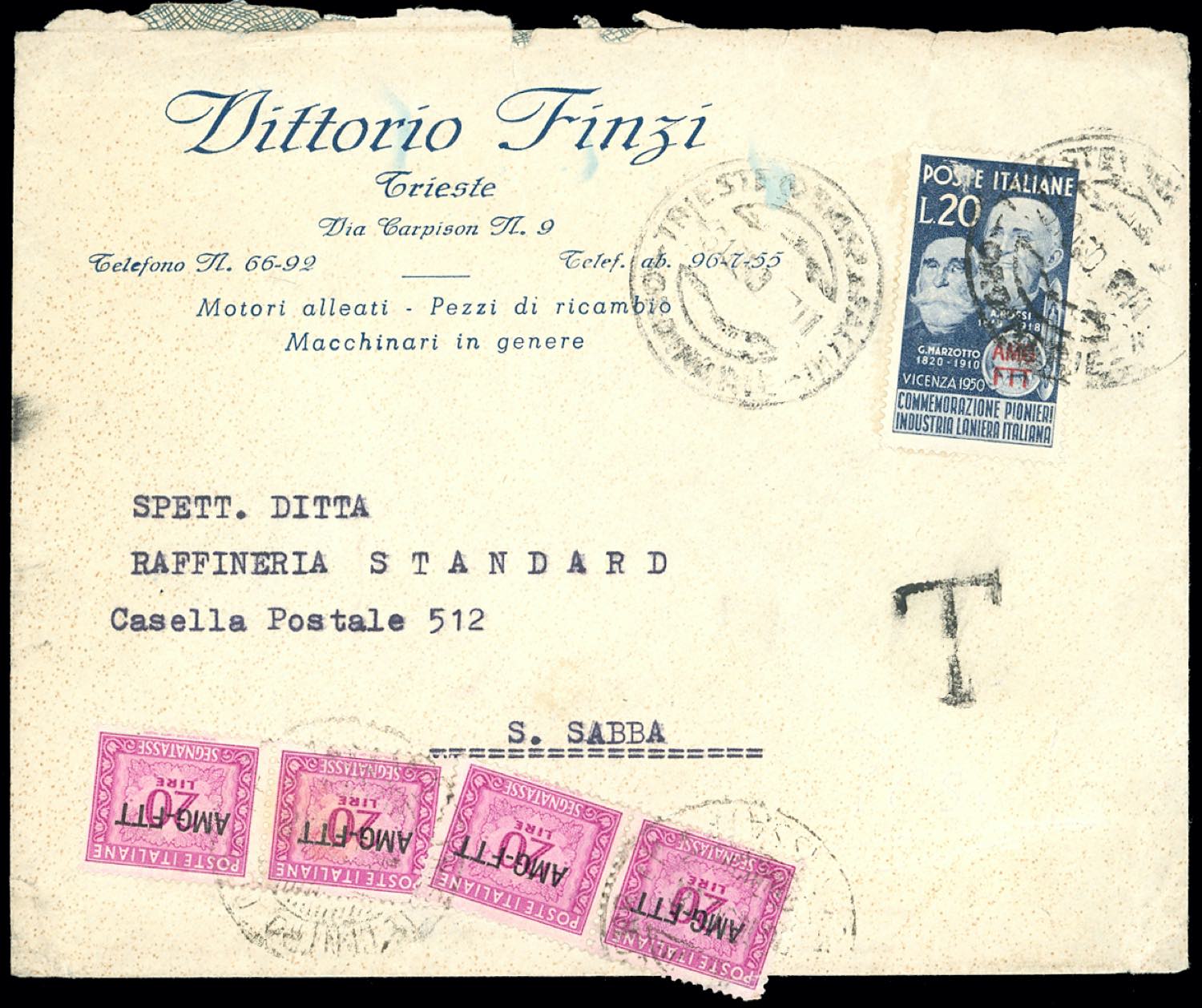 SEGNATASSE 1950 - 20 lire, soprastampa su una riga (24), due coppie, su lettera insufficientemente affrancata e tassata per il porto affrancata con 20 lire Lana (83) da Trieste 5/10/1958 a San Sabba. Pregevole tassazione "interna" a Trieste.