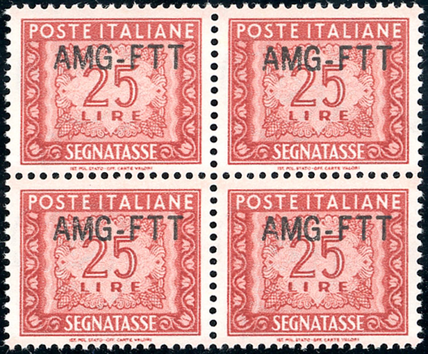 SEGNATASSE 1954 - 25 lire, nuovo tipo di soprastampa (25A), blocco di quattro, ottima centratura, gomma originale integra, perfetto. Bello! ... Leggi tutto