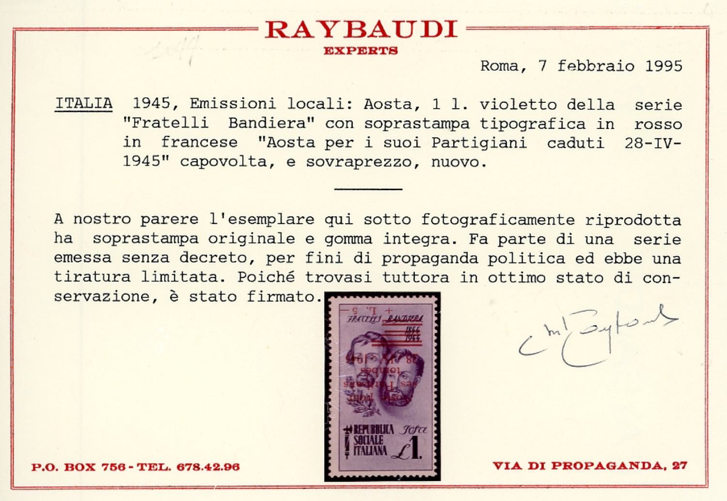 AOSTA 1945 - 1 lira Fratelli Bandiera, soprastampa "Aosta per i suoi Partigiani" in rosso capovolta (cfr. Errani/Raybaudi pag.190), gomma originale integra, perfetto. Raro. Cert. Raybaudi.