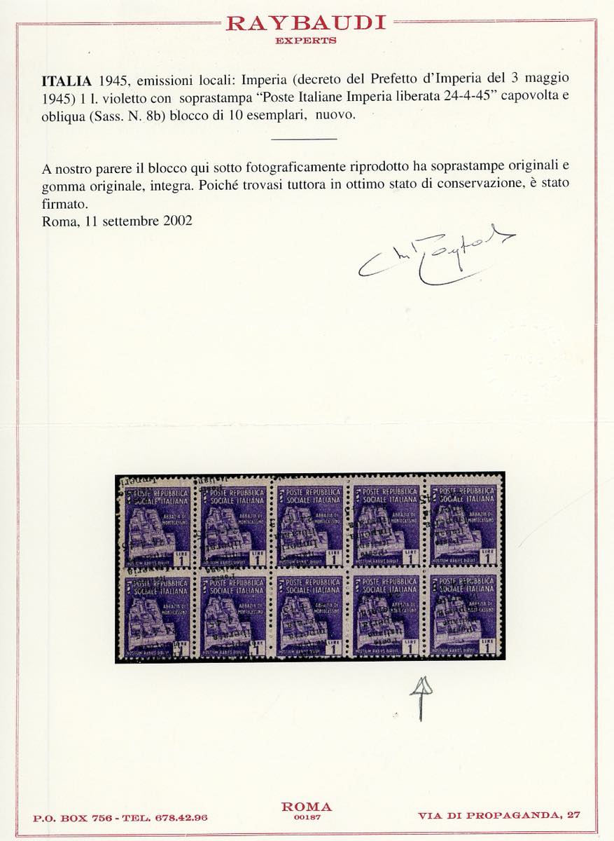 IMPERIA 1945 - 1 lira, soprastampa capovolta e obliqua (8b), blocco di quattro, gomma integra, perfetto. Ferrario, cert. Raybaudi del blocco di provenienza.