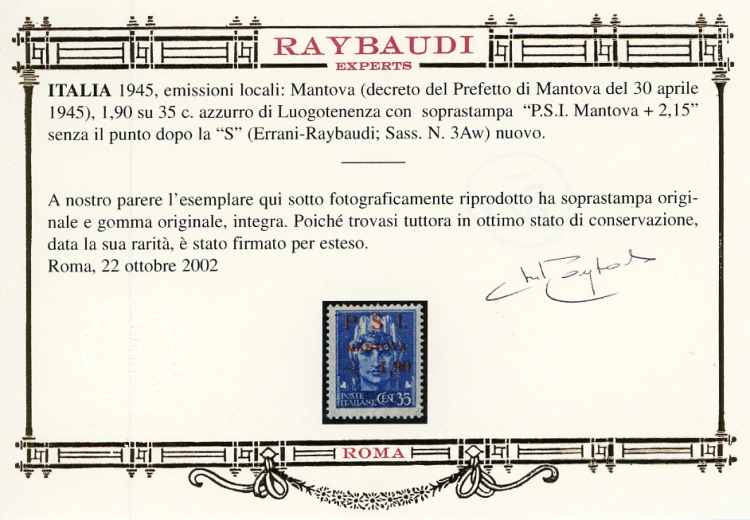 MANTOVA 1945 - 1,90 su 35 cent., errore di valore, senza punto dopo la "S" (3Aw), gomma originale integra, perfetto. Molto raro! Cert. Oro Raybaudi.