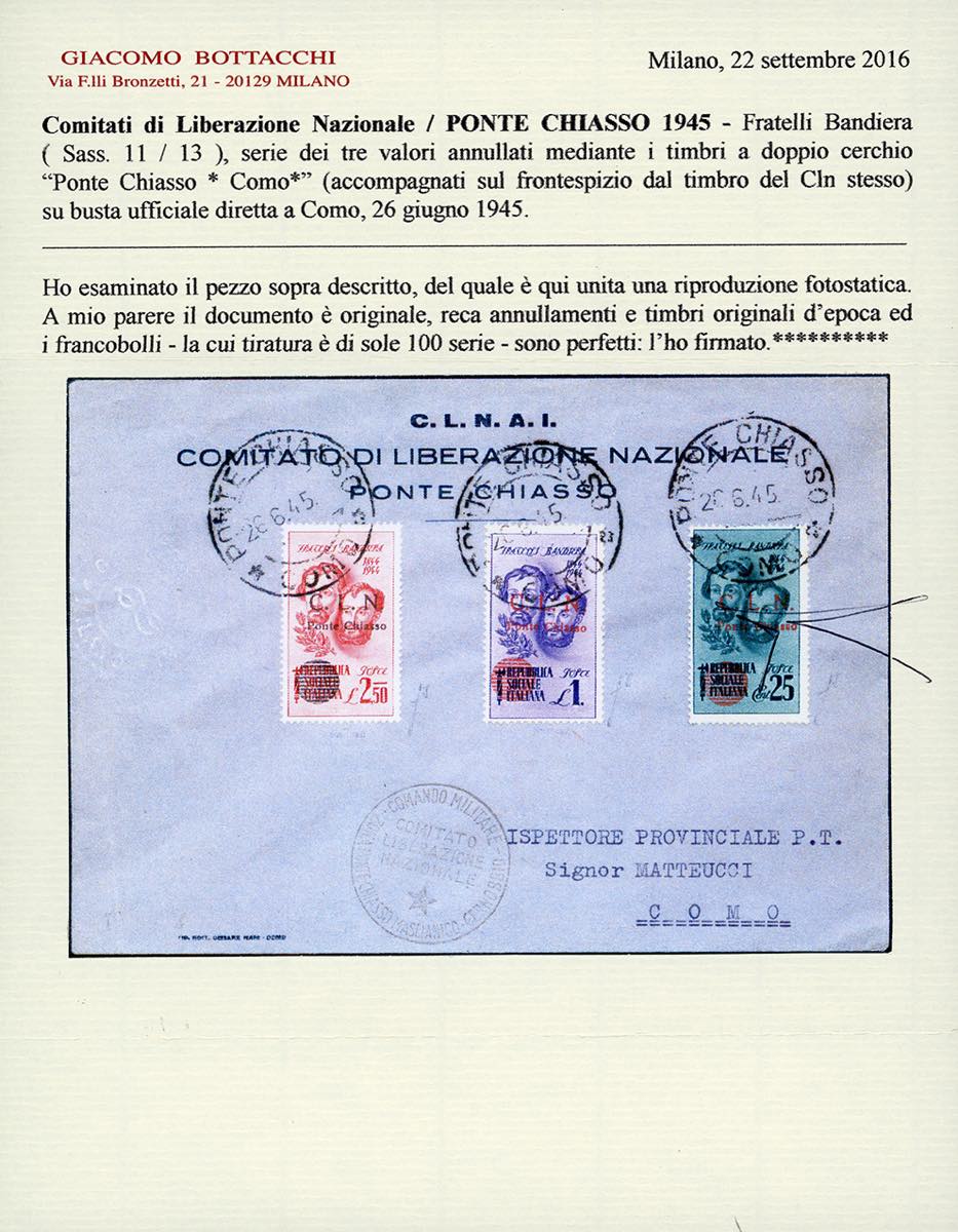 PONTE CHIASSO 1945 - L'emissione completa (1/14), perfetta, su due buste ufficiali da Ponte Chiasso rispettivamente del 25 e 26/6/1945. Raro insieme. Fiecchi, cert. Bottacchi.