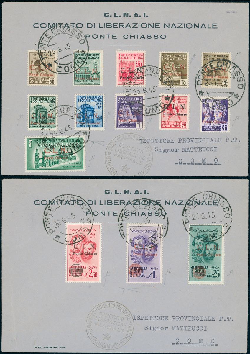 PONTE CHIASSO 1945 - L'emissione completa (1/14), perfetta, su due buste ufficiali da Ponte Chiasso rispettivamente del 25 e 26/6/1945. ... Leggi tutto
