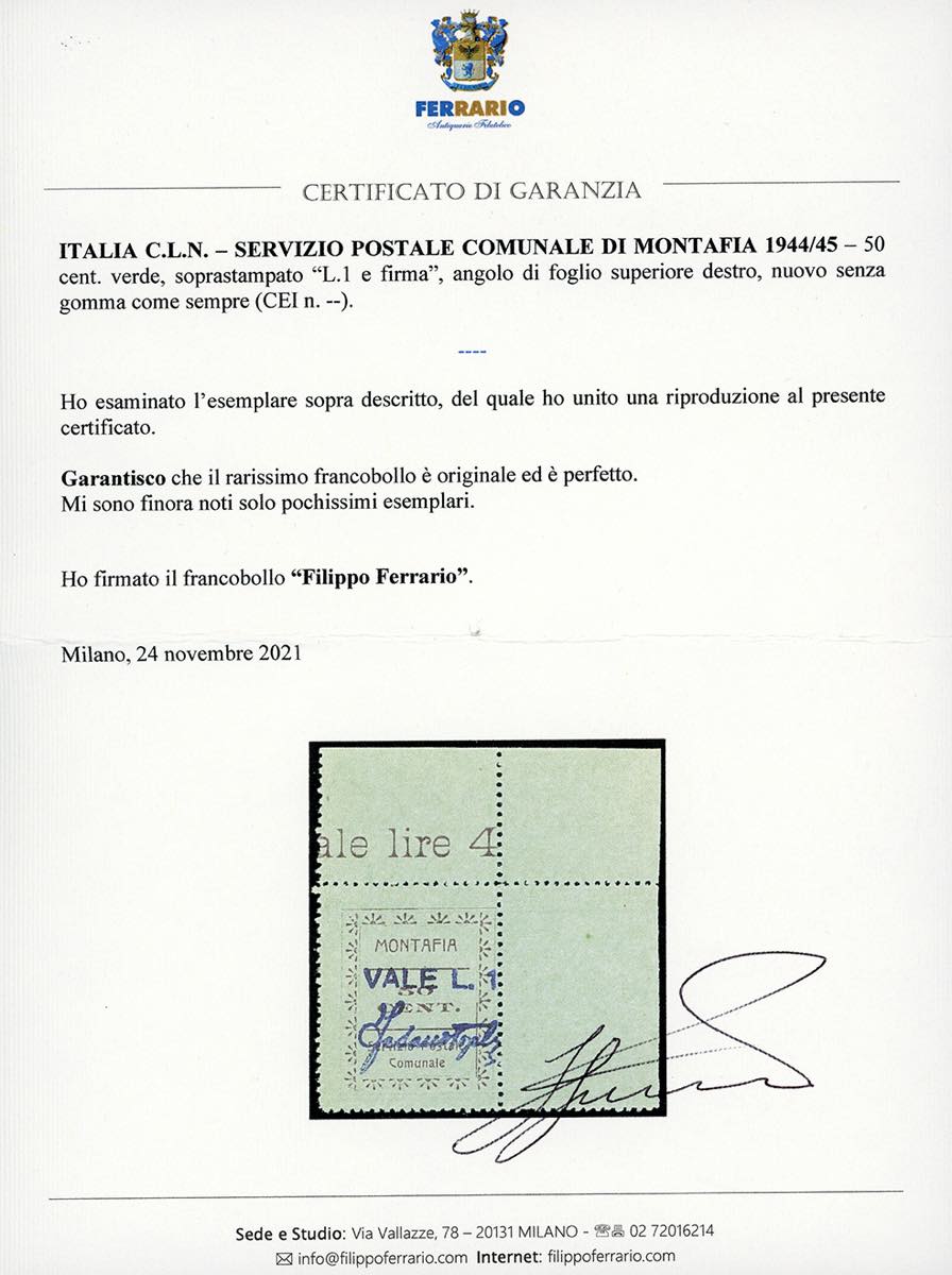 SERVIZIO POSTALE COMUNALE ARAMENGO,COCCONATO,CORTAZZONE,MONTAFIA,PIEA,PIOVA' MASSAIA 1944/45 - Serie completa di sei valori da 50 cent., soprastampati L.1 e firma (vedi catalogo CEI), nuovi, senza gomma come sempre, perfetti, angolo di foglio. Splendidi e rarissimi, solo poche serie conosciute, finora non catalogati. Rarità del settore. Cert. Ferrario.