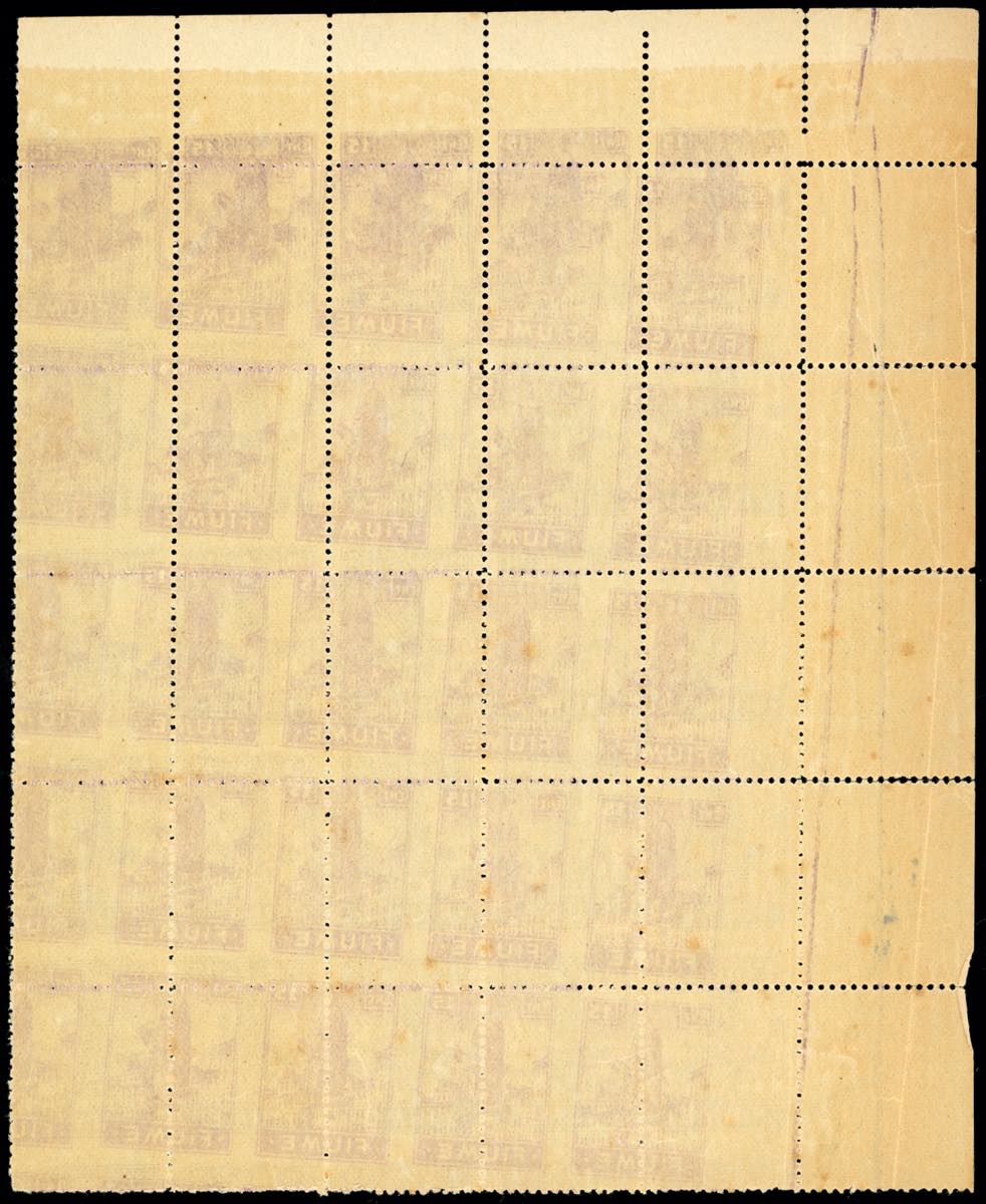 FIUME 1919 - 15 cent. Vedute, carta tipo "A", dentellatura orizzontale fortemente spostata in basso (A36nb), blocco di 25 esemplari, angolo di foglio, gomma originale integra, perfetti. Raro.