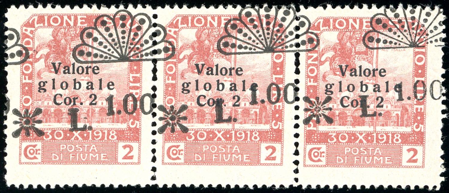 Lotto 1628 - FIUME SEGNATASSE 1921 - 1 lira su 2 corone, striscia di ...