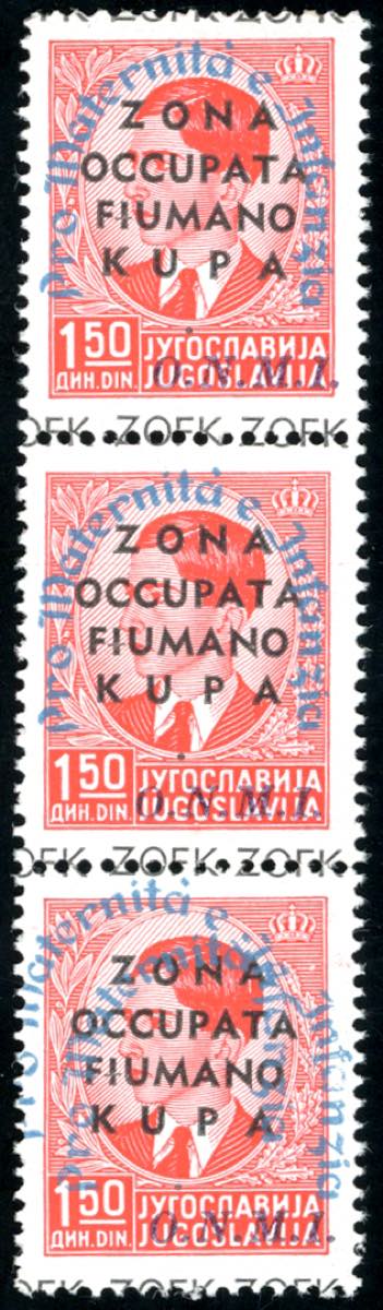 ZONA FIUMANO KUPA 1942 - 1,50 d. Pro Maternità Infanzia, striscia verticale di tre, l'ultimo esemplare con doppia soprastampa (38/38b), ... Leggi tutto