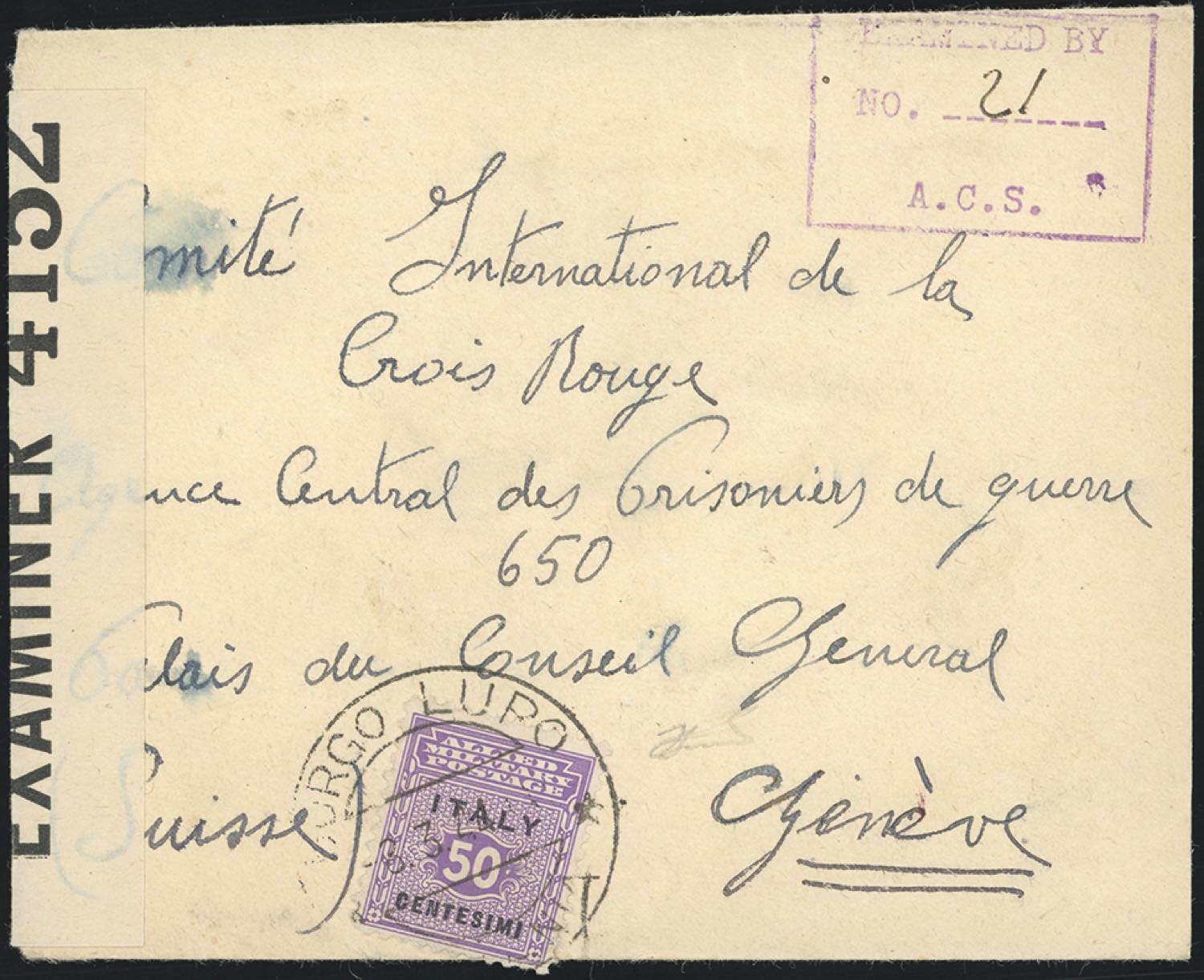 AMGOT OCCUPAZIONE ANGLO-AMERICANA SICILIA 1943 - 50 cent. (4), buono stato, su busta da Borgo Lupo 8/3/1944 a Ginevra, verificata per censura. Molto rare le lettere del periodo per l'estero (ad eccezione degli Stati Uniti).