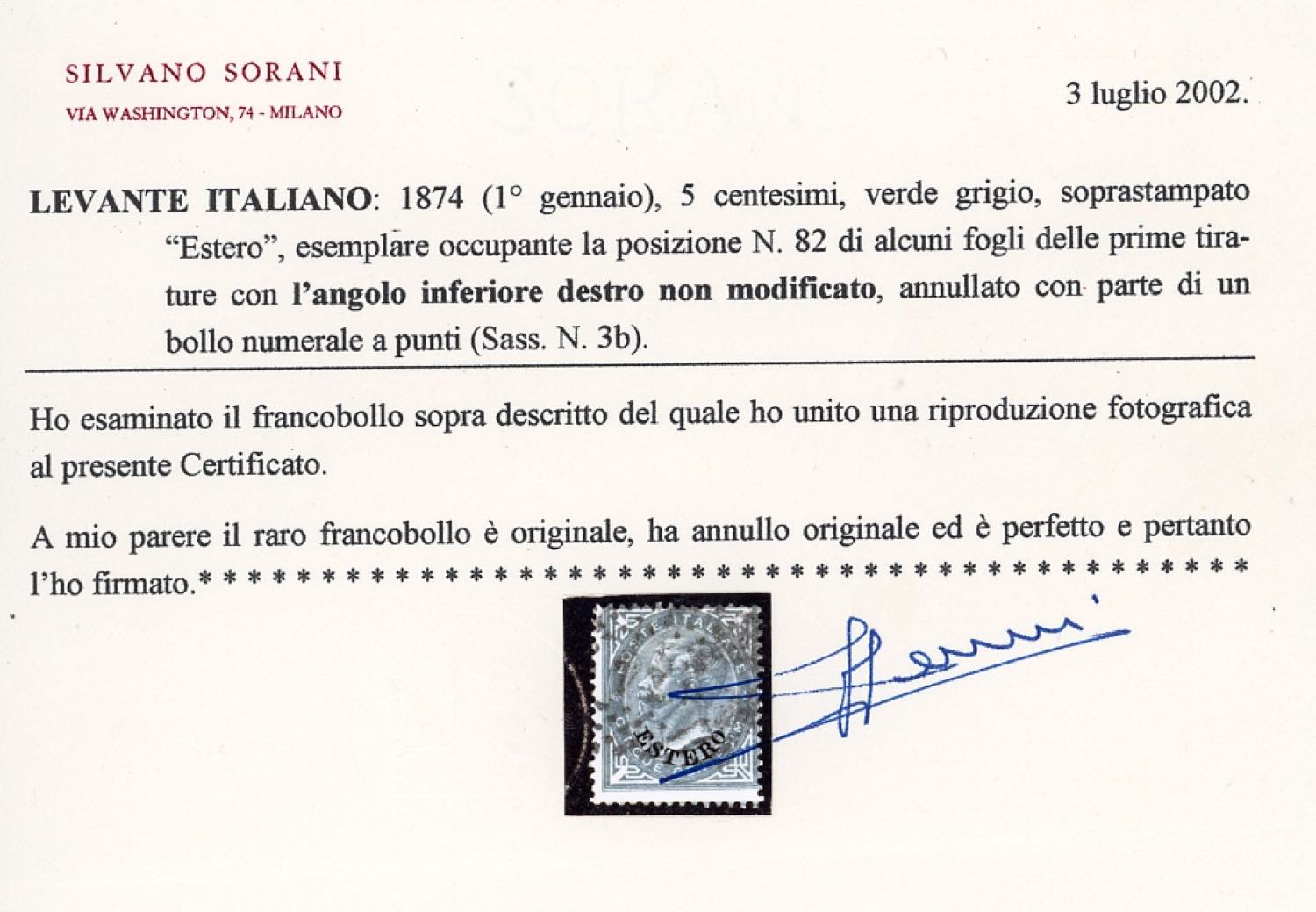 EMISSIONI GENERALI 1874 - 5 cent. soprastampato, angolo non modificato (3b), perfetto, usato. Raro! A. Diena, cert. Sorani.