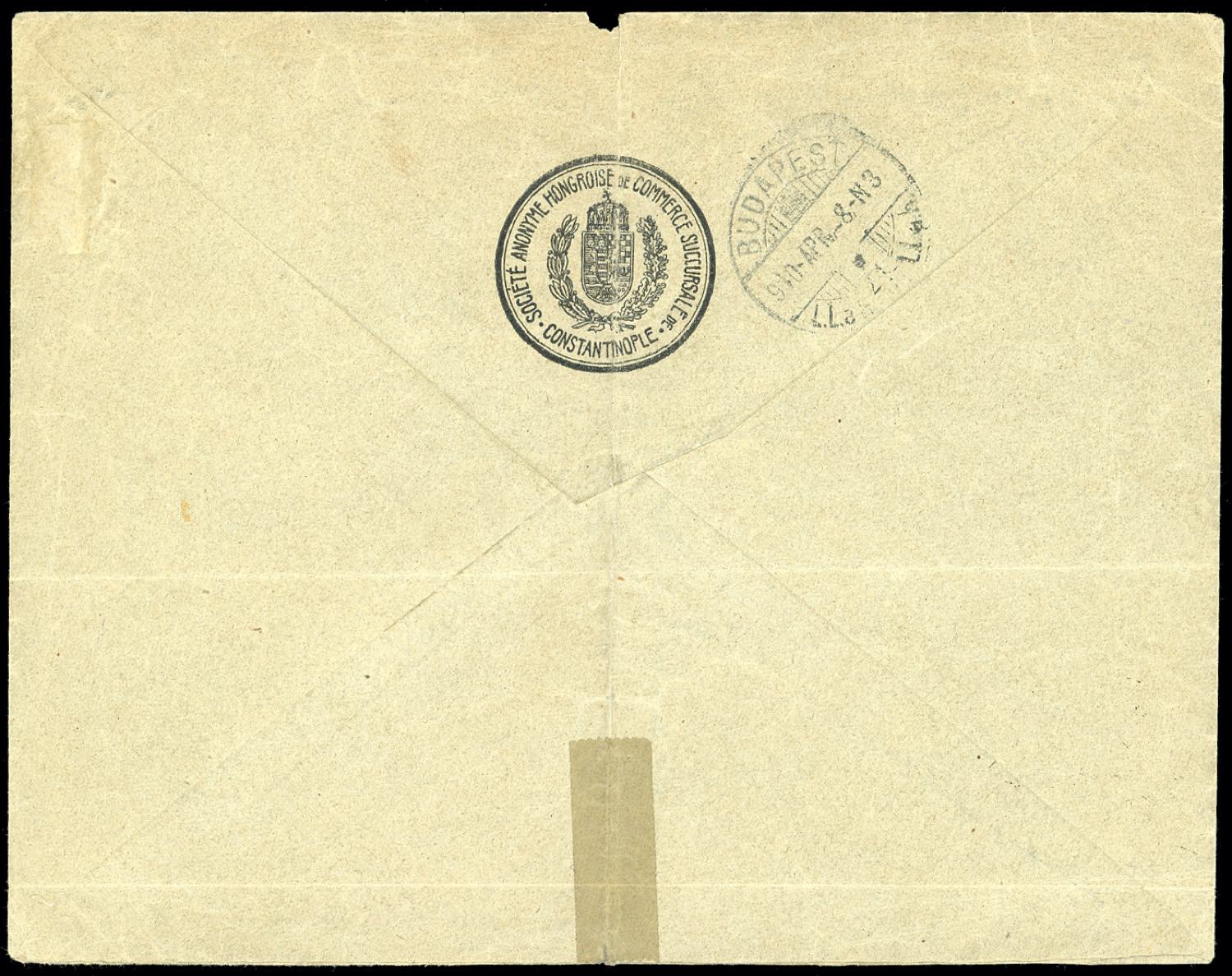 COSTANTINOPOLI 1910 - 20 piastre su 5 lire azzurro e rosa (26), perfetto, isolato su raccomandata da Costantinopoli 6/4/1910 per l'Ungheria. Molto raro l'uso isolato! Ferrario.