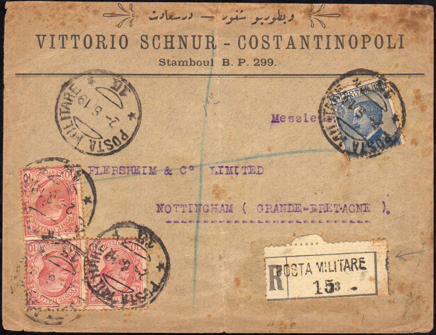 COSTANTINOPOLI 1919 - 10 cent. Leoni, tre esemplari, 25 cent. Michetti (Regno 82,83), otttimo stato, su busta raccomandata dalla Posta Militare n. 15 2/6/1919 per la Gran Bretagna. Non comune!