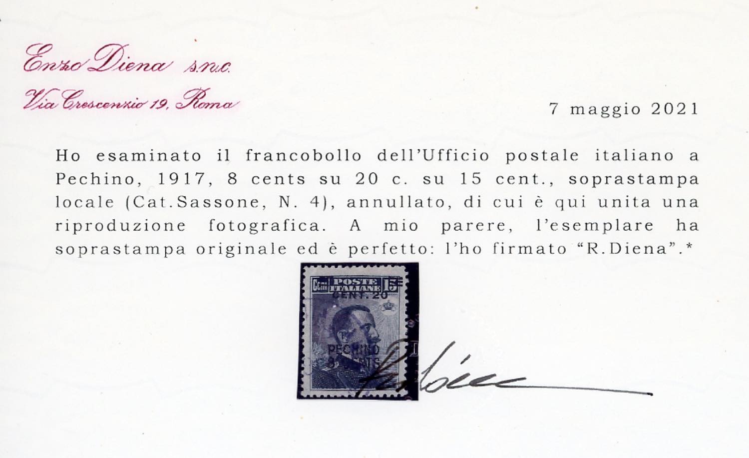 PECHINO 1917 - 8 cent. su 20 cent. su 15 cent. (4), usato, perfetto. Bello e raro. Grioni, E.Diena, cert. Diena e Ferrario.