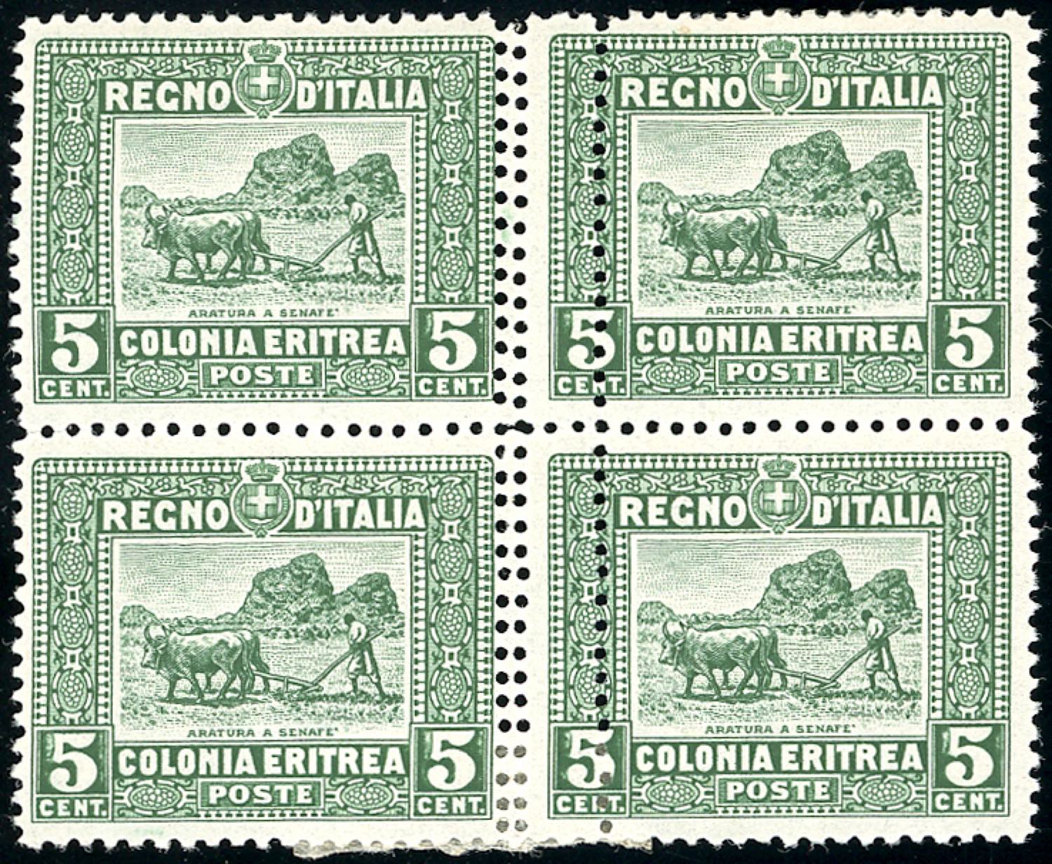 1914 - 5 cent. Soggetti Africani, dent. 13 1/4, blocco di quattro con due coppie orizzontali con tripla dentellatura al centro (34e), gomma ... Leggi tutto