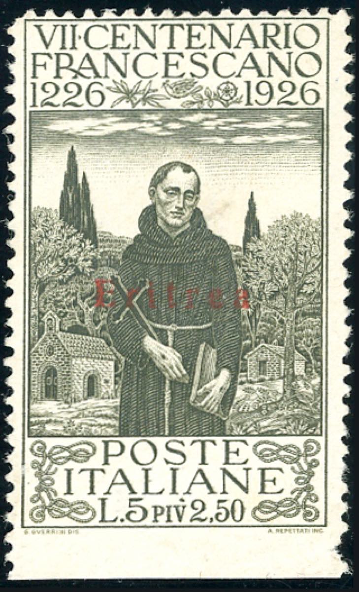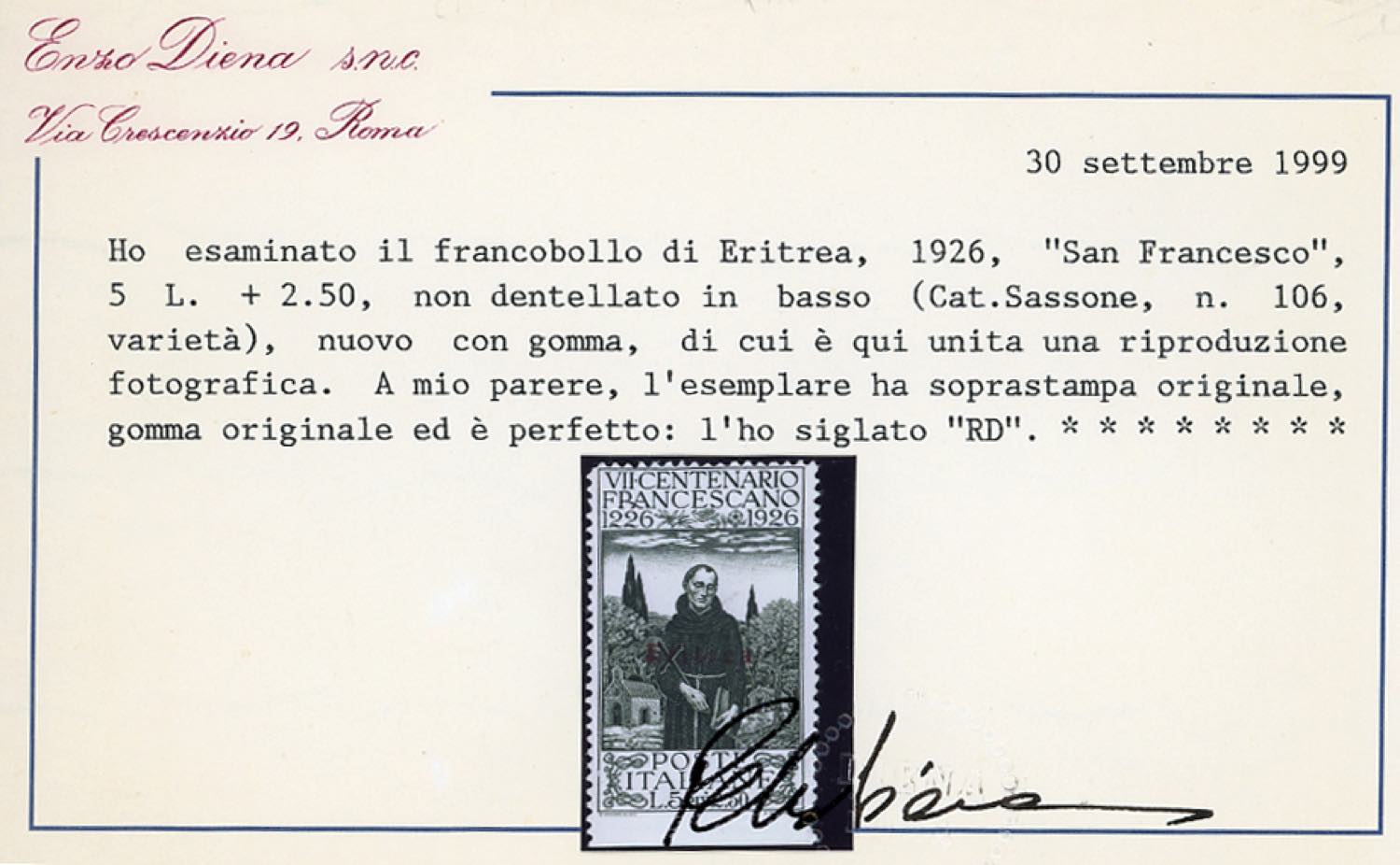 1926 - 5 + 2,50 lire San Francesco, non dentellato in basso (106), gomma originale, perfetto e molto fresco. Varietà molto rara e non catalogata. Cert. Diena.