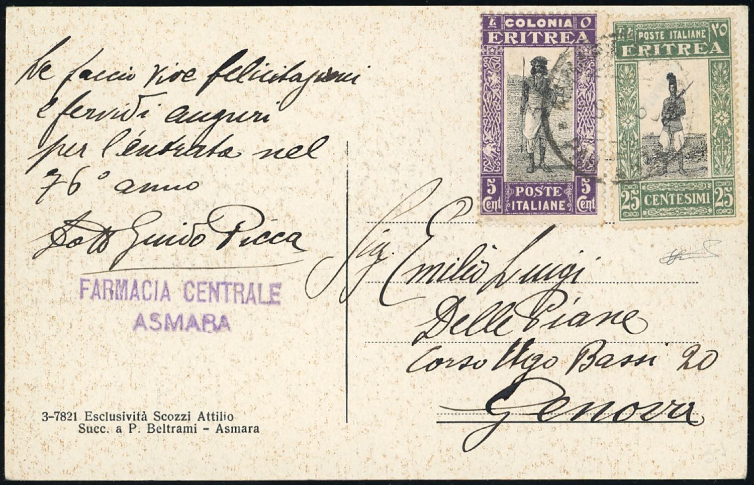1930 - 5 cent., 25 cent. Soggetti africani (156,159), perfetti, su cartolina da Asmara a Genova. Ferrario.