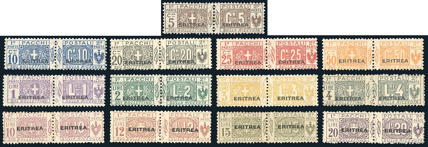 PACCHI POSTALI 1917/24 - Nodo di Savoia al centro, soprastampa grande, serie completa (9/21), gomma originale integra, perfetti. Cert. Ferrario.