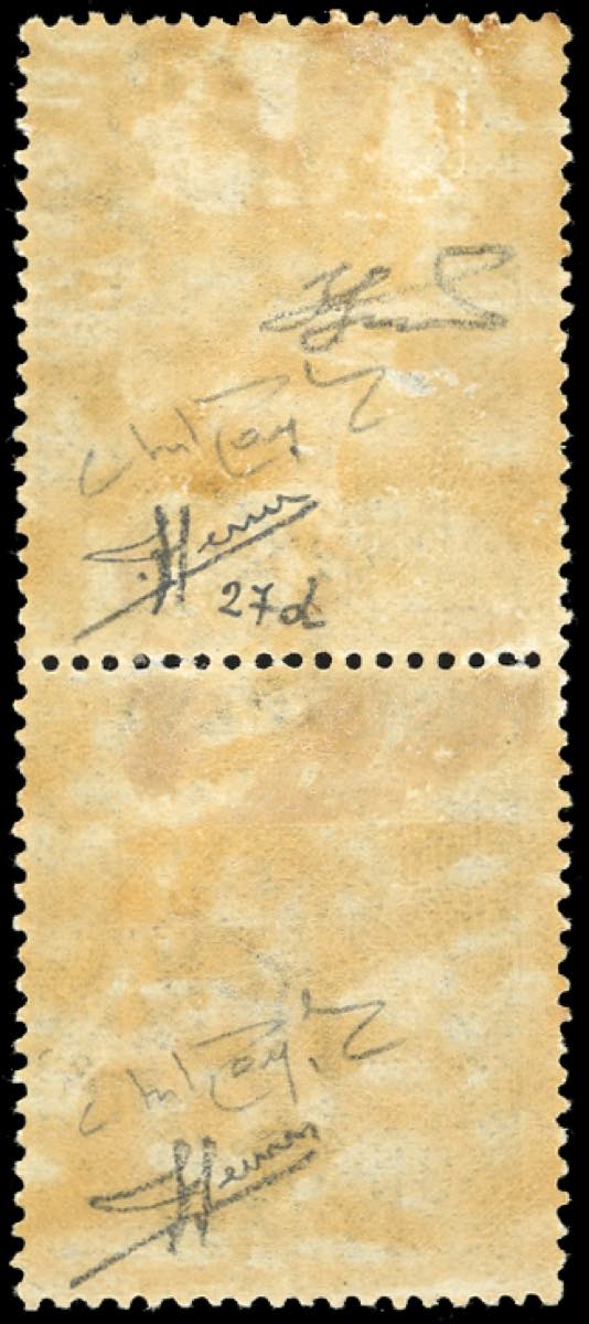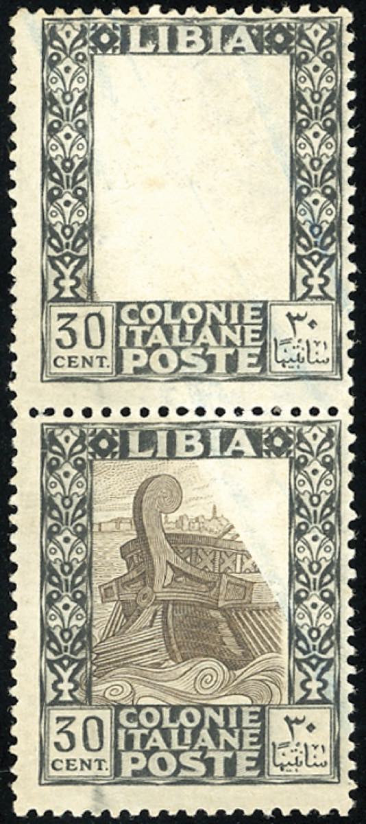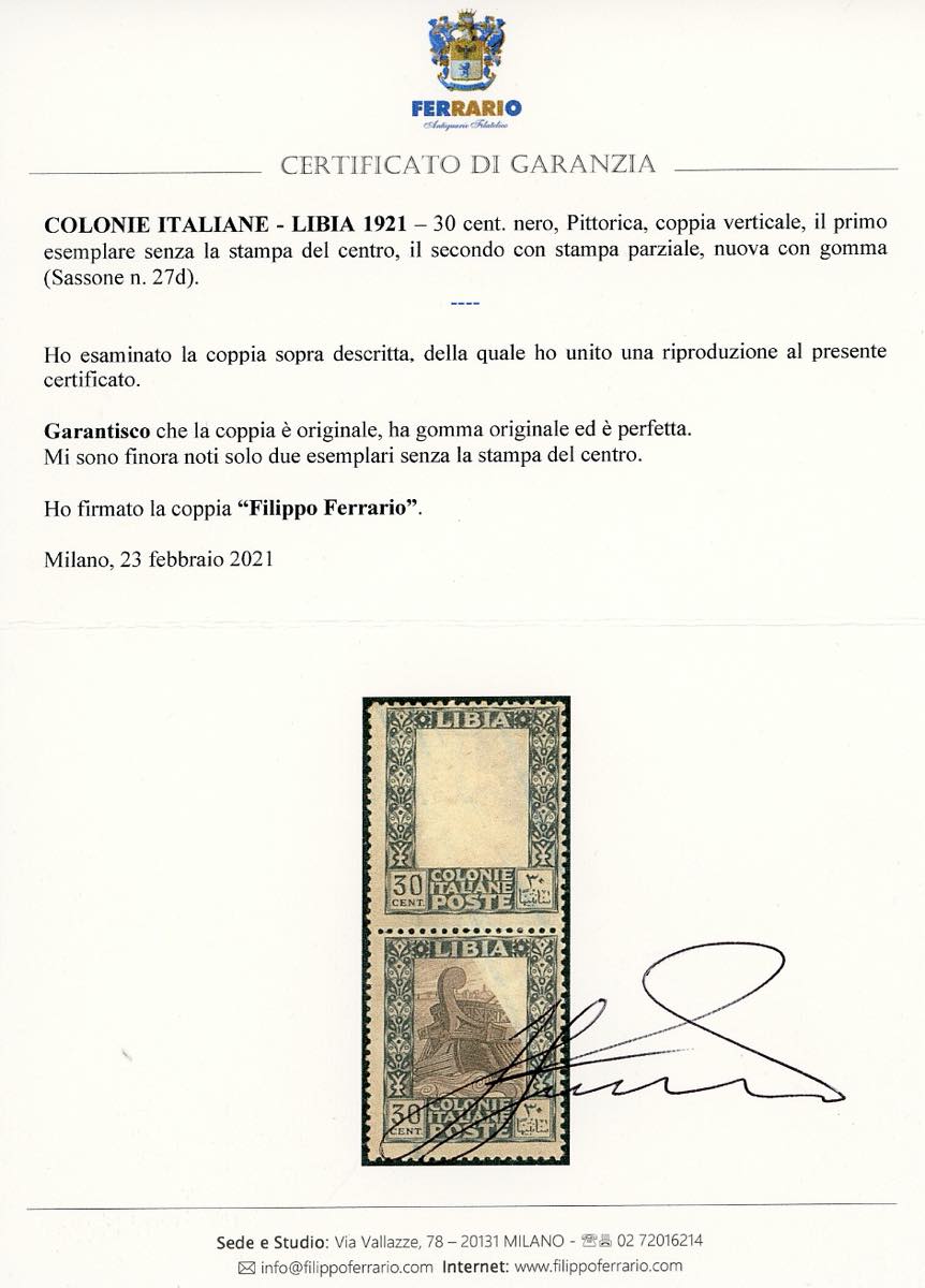 1921 - 30 cent. Pittorica, coppia verticale, il primo esemplare senza la stampa del centro, il secondo con stampa parziale (27d + varietà ... Leggi tutto
