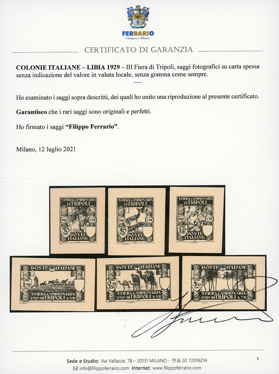 1929 - III Fiera di Tripoli (81/86), saggi fotografici senza indicazione del valore in valuta locale, senza gomma come sempre, perfetti. Belli e rari. Cert. Ferrario.