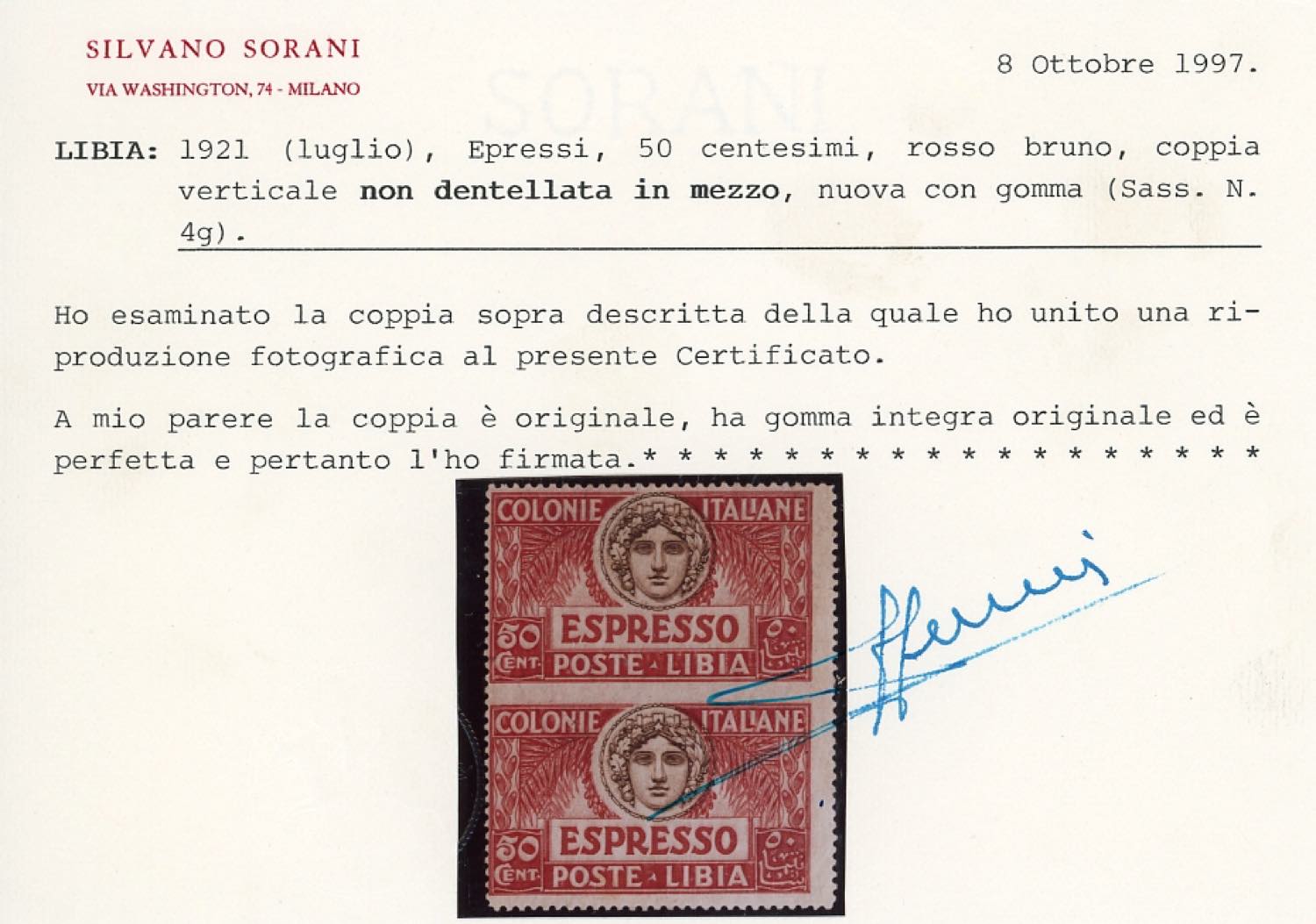 ESPRESSI 1921 - 50 cent., coppia verticale non dentellata al centro (4g), gomma integra, perfetta. Rara. Cert. Sorani.