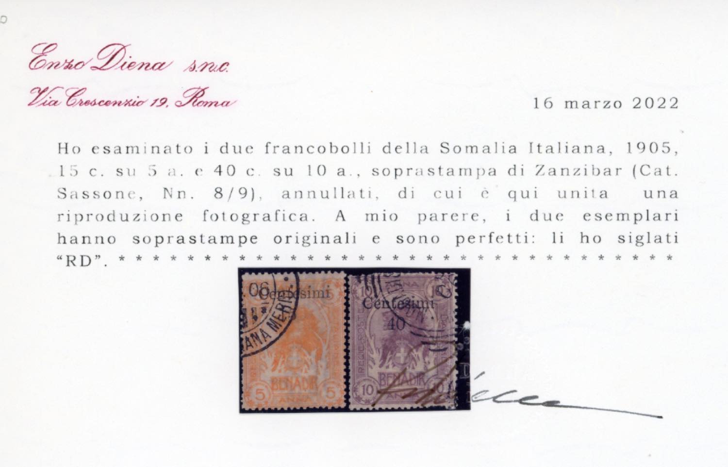 1905 - Soprastampati di Zanzibar, serie completa (8/9), usati, perfetti. Em.Diena il primo, cert. Diena per la serie.