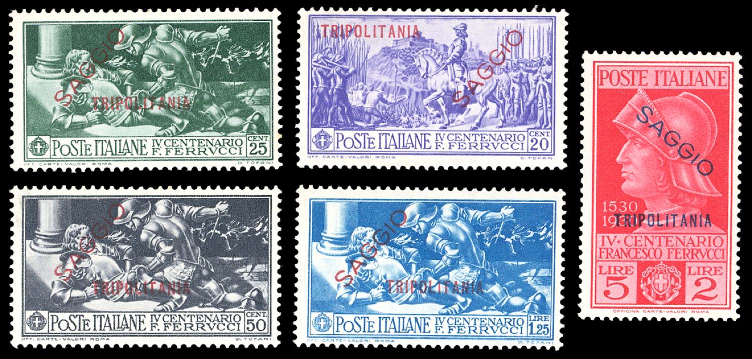 1930 - Ferrucci, posta ordinaria, serie completa soprastampata "SAGGIO" (64/68), gomma originale integra, perfetti. Ferrario.