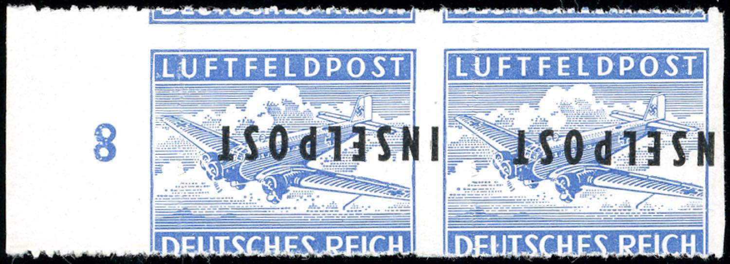 OCCUPAZIONE TEDESCA EGEO 1944 - Inselpost azzurro, emissione di Rodi, soprastampa capovolta e fortemente spostata a sinistra e perforazione fortemente spostata (2aa), coppia orizzontale, bordo di foglio, gomma integra, perfetta. Rara. Cert. Mogler.