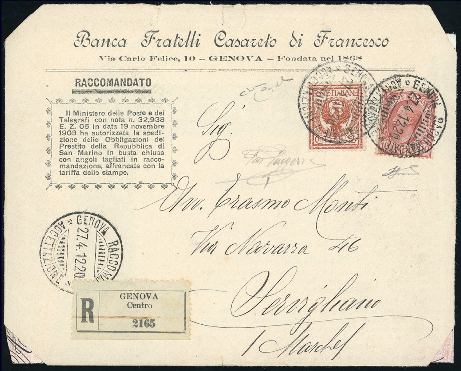 1911 - 2 cent. Floreale, 10 cent. Leoni (69,82), perfetti, su busta raccomandata in tariffa agevolata prevista per le Obbligazioni del Prestito della Repubblica di San Marino (tariffa stampe), angoli tagliati secondo la normativa, da Genova 27/4/1912 a Servigliano. Molto rara e di grande interesse storico postale. Gaggero, Raybaudi, Ferrario.