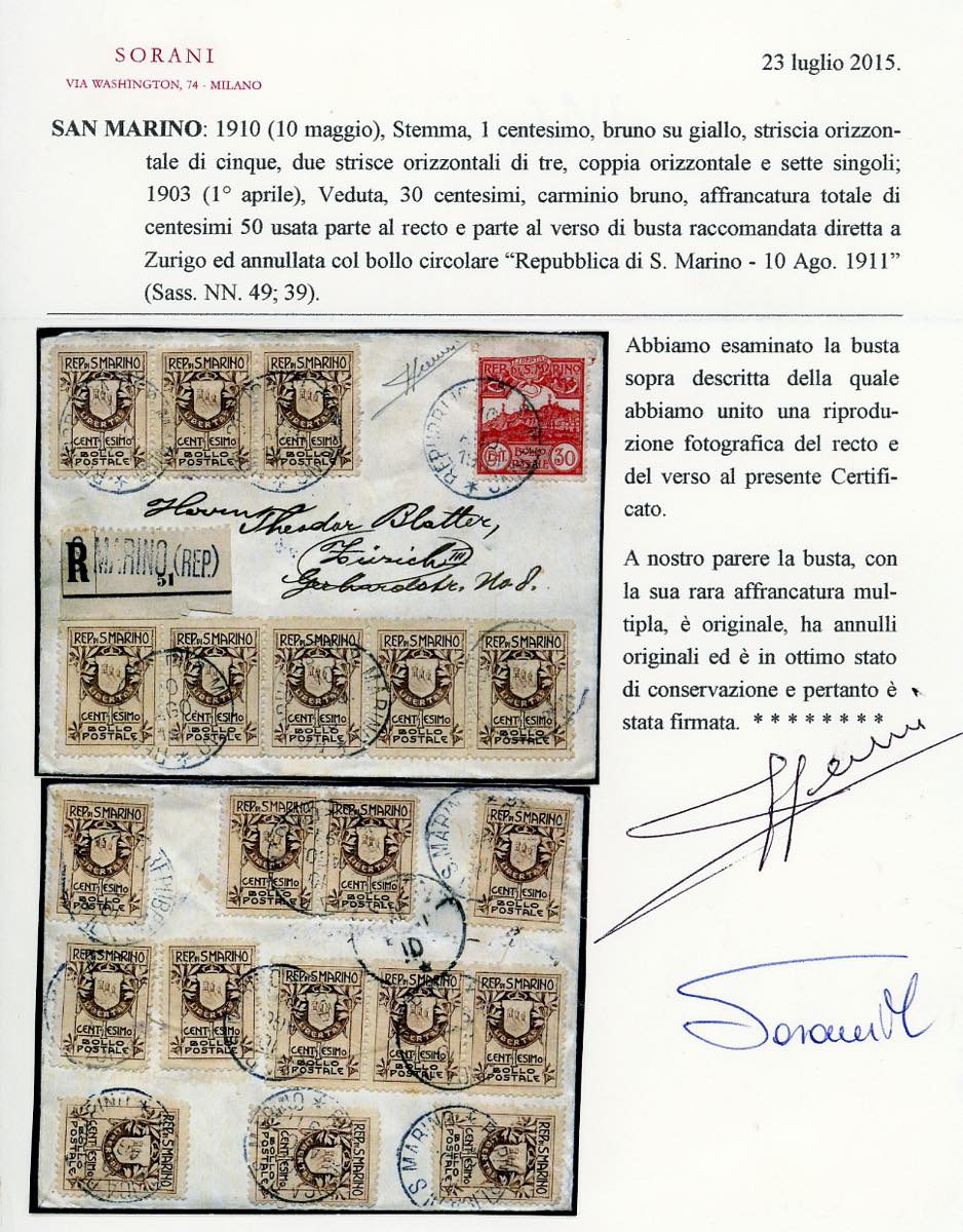 1911 - 1 cent. Stemma, fondo giallo, venti esemplari, 30 cent. Veduta (49,39), ottimo stato, in affrancatura fronte/recto su busta raccomandata da San Marino 10/8/1911 a Zurigo. Rarissima, la massima affrancatura nota di questo francobollo. Ferrario, cert. Sorani.