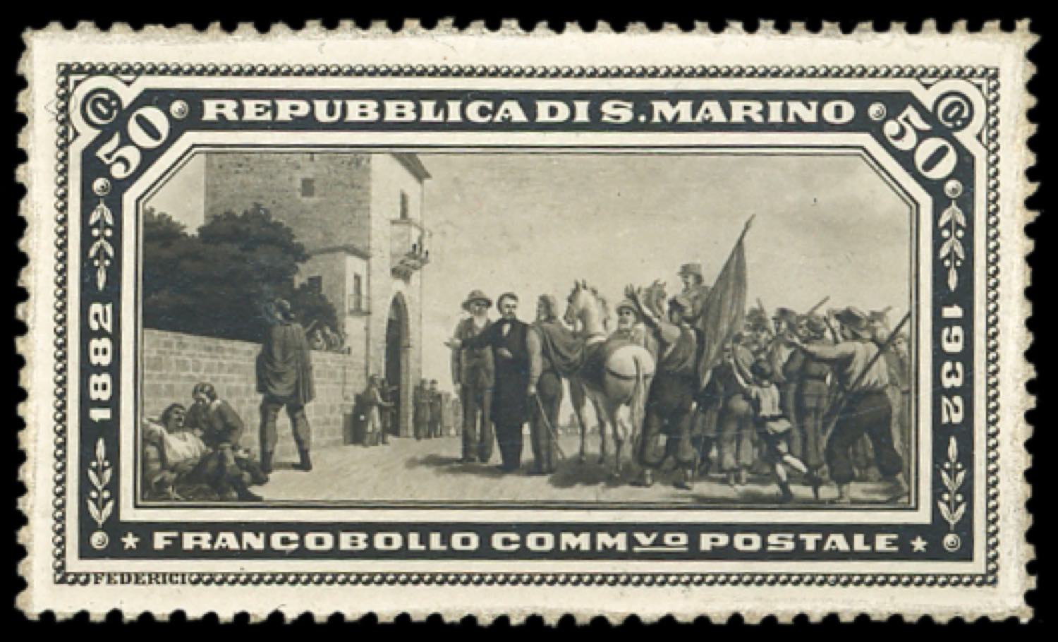 1932 - 50 cent. Garibaldi (171), prova fotografica di E.Federici in nero, dentellata, applicata su cartoncino nero, con soggetto non adottato per questo valore (l'immagine è stata utilizzata per il francobollo da 75 cent. e successivi dell'emissione definitiva), senza gomma, perfetta. Molto rara. Cert. Caffaz e Raybaudi.