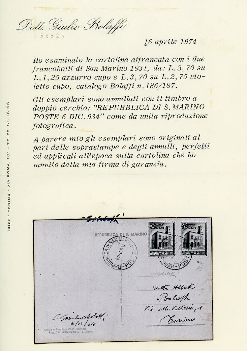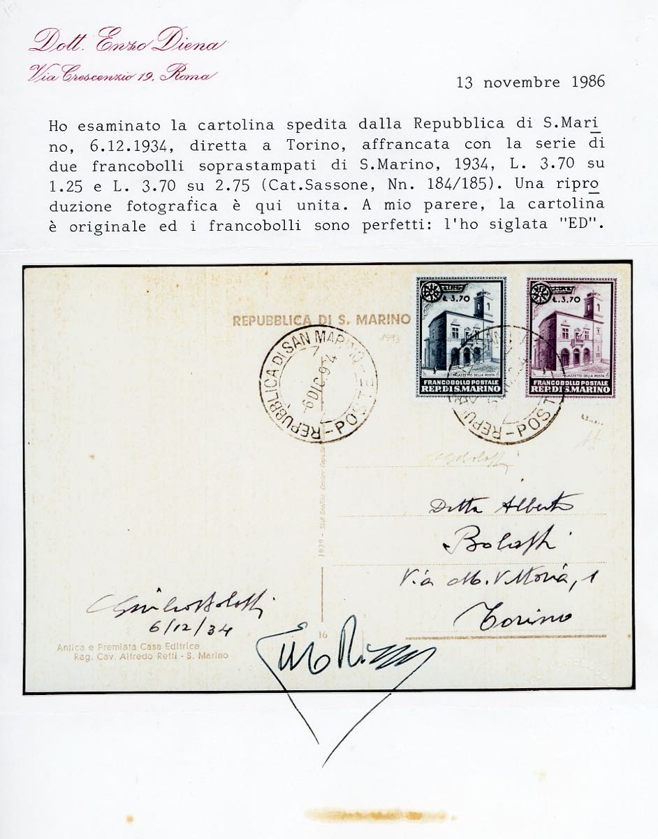 1934 - Palazzetto della Posta soprastampati (184/185), perfetti, su cartolina autografa di Giulio Bolaffi da San Marino 6/12/1934 a Torino. Ferrario, cert. Bolaffi e E.Diena.