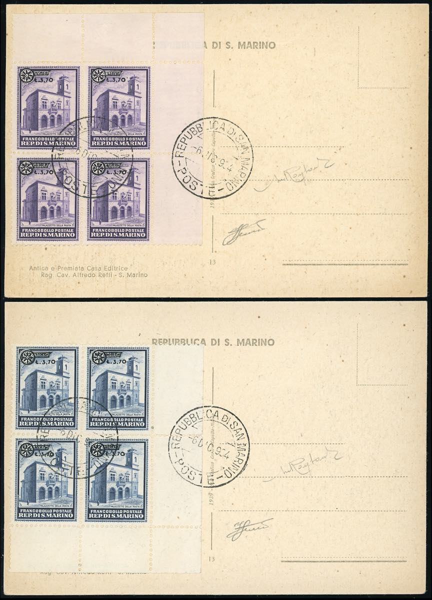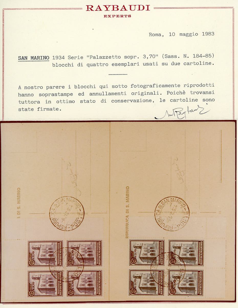 1934 - Palazzetto della Posta soprastampati, serie completa (184/185) in rari blocchi di quattro, perfetti, angolo di foglio, usati su due cartoline non viaggiate. Ferrario, cert. Raybaudi.