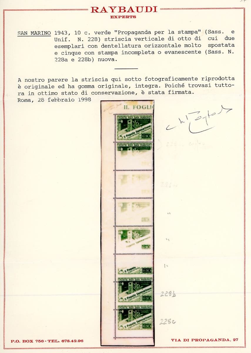 1943 - 10 cent. Propaganda per la stampa, striscia verticale di otto, quattro esemplari con stampa evanescente, tre con dentellatura orizzontale fortemente spostata in basso (228d), angolo di foglio, gomma originale integra, perfetta. Bella varietà, d'effetto. Cert. Raybaudi e Avanzo.