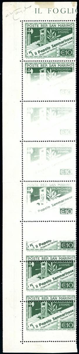 1943 - 10 cent. Propaganda per la stampa, striscia verticale di otto, quattro esemplari con stampa evanescente, tre con dentellatura ... Leggi tutto