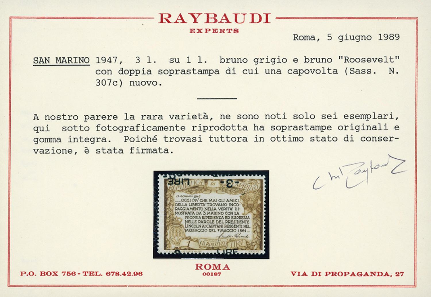 1947 - 3 lire su 1 lira Roosvelt, doppia soprastampa di cui una capovolta (307c), gomma integra, perfetto. Molto rara, SOLO 6 ESEMPLARI NOTI. E.Diena, Ferrario, cert. Raybaudi.