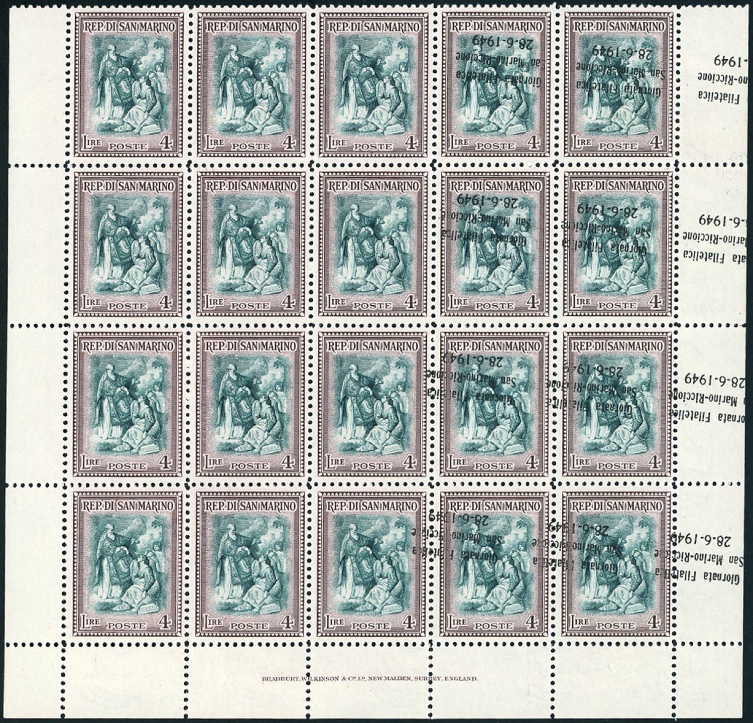 1949 - 4 lire Alberoniana, blocco di venti con soprastampa capovolta, obliqua e parziale "Giornata Filatelica San Marino - Riccione 28/6/1949" (314) di probabile origine privata. Insieme raro e non catalogato.