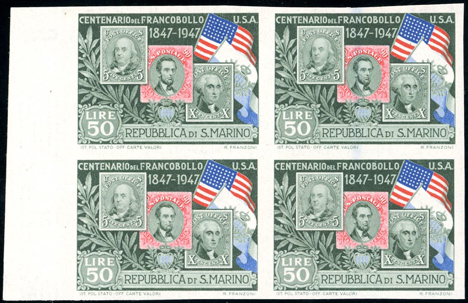 1947 - 50 lire Centenario francobollo Stati Uniti, non dentellato (335b), blocco di quattro, bordo di foglio, gomma integra, perfetto. Ferrario.