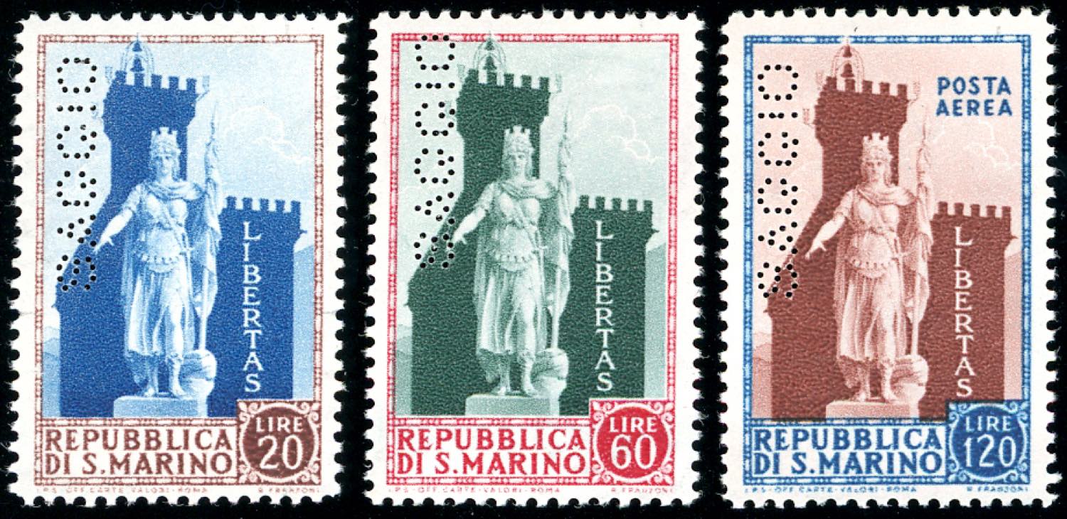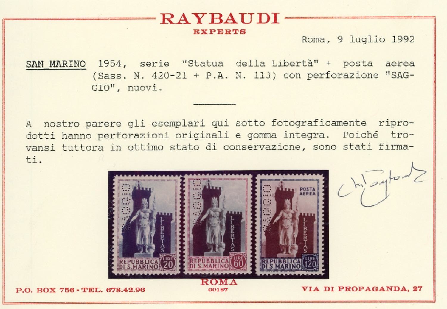 1954 - Statua della Libertà, serie completa (420/421+A113), perforati "saggio", gomma originale integra, perfetti. Cert. Raybaudi.