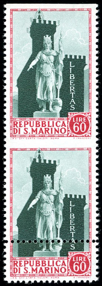 1954 - 60 lire Statua della Libertà, coppia verticale, non dentellata al centro e in alto e con doppia dentellatura in basso (421d), gomma originale integra, perfetta. Ferrario.