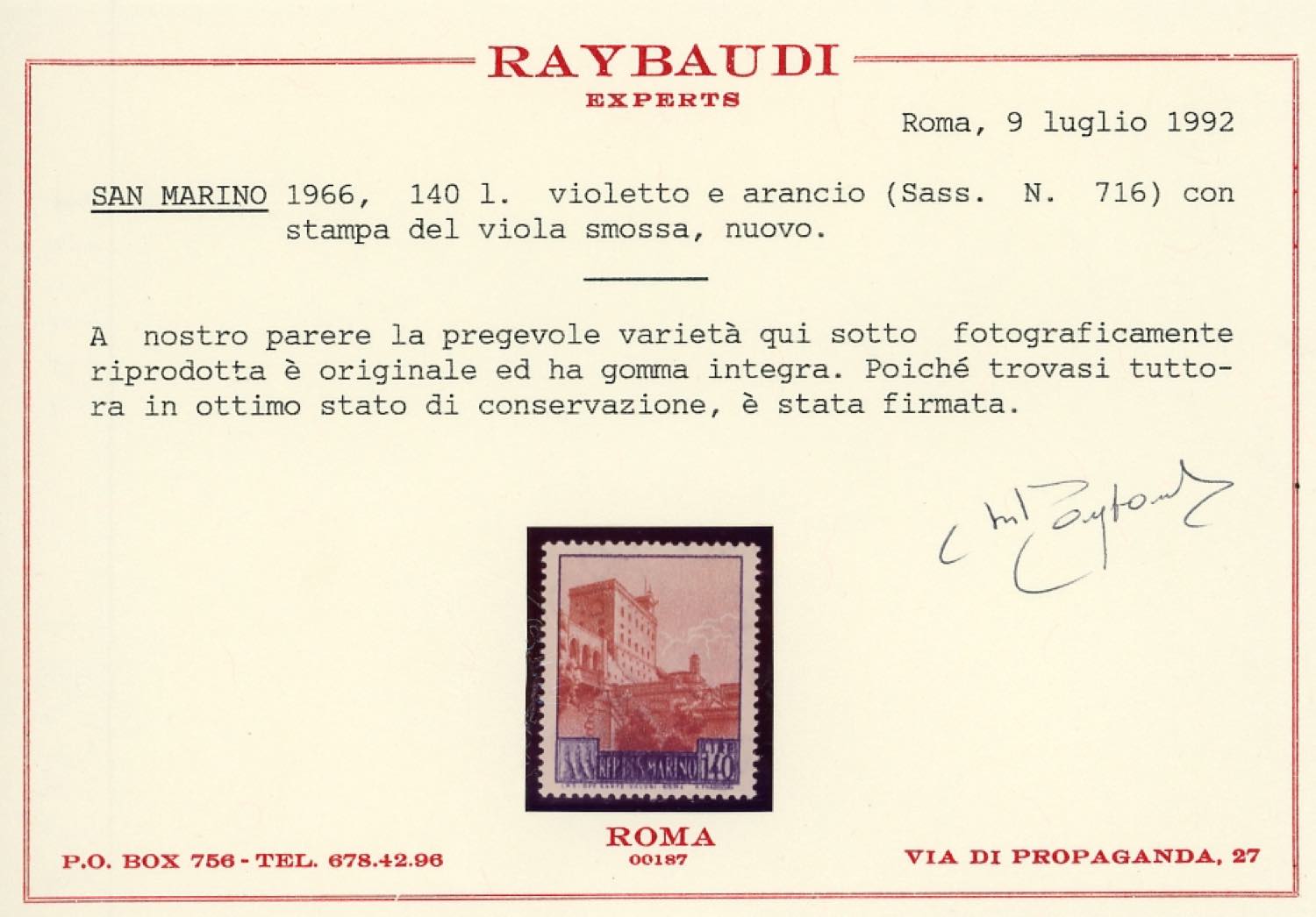 1966 - 140 lire Vedute, stampa del violetto smossa (716), gomma originale integra, perfetto. Bella varietà non catalogata. Cert. Raybaudi.